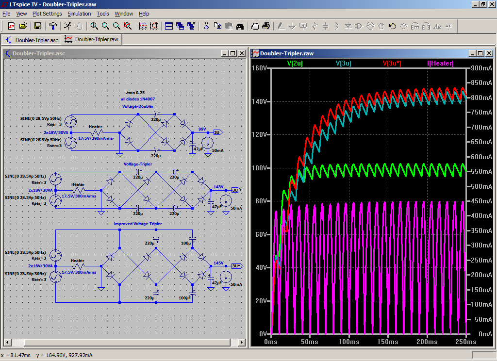 Dieses Schaltungsprinzip eines Vollwellen-Spannungsverdoppler/-vervielfacher findet man nur selten in den Fachveröffentlichung und vielleicht ist es auch für andere u.U. mit anderen Trafospannungen interessant.