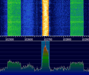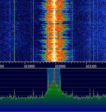 Ein typisches HD-Spektrum eines analogen UKW-Signals mit 1 bis 2 Digitalradioprogrammen (Services) sähe so aus: