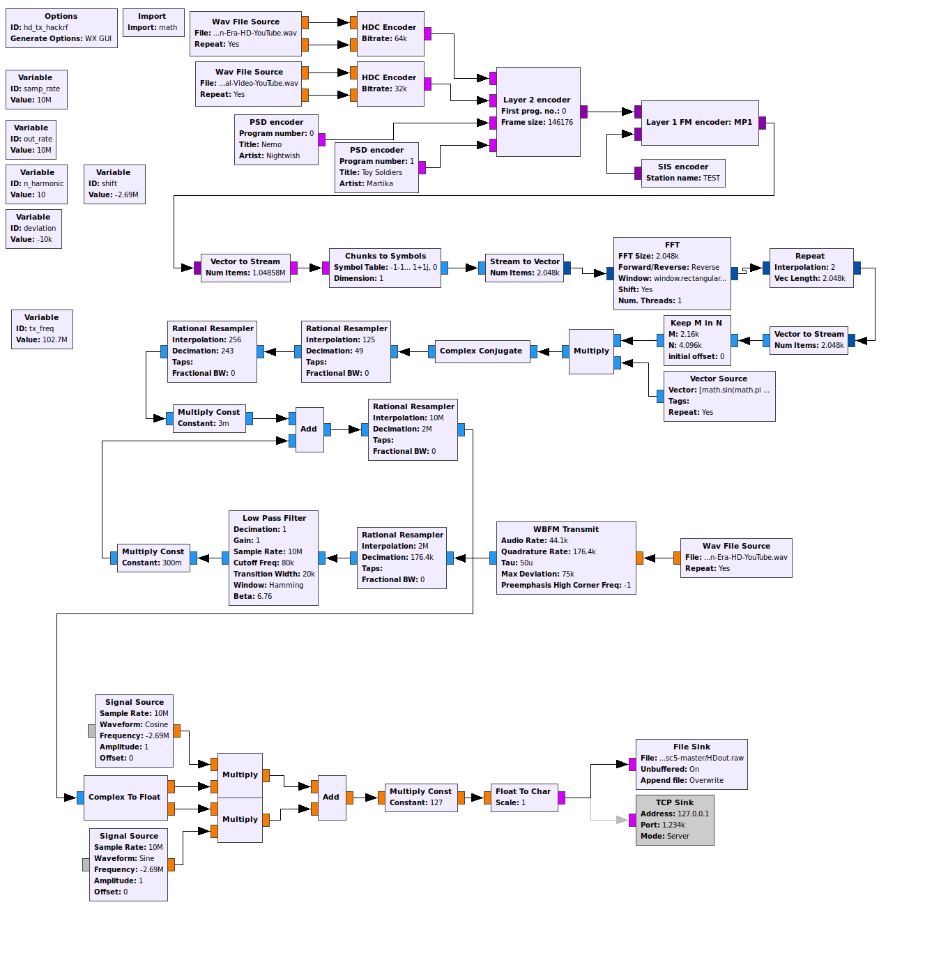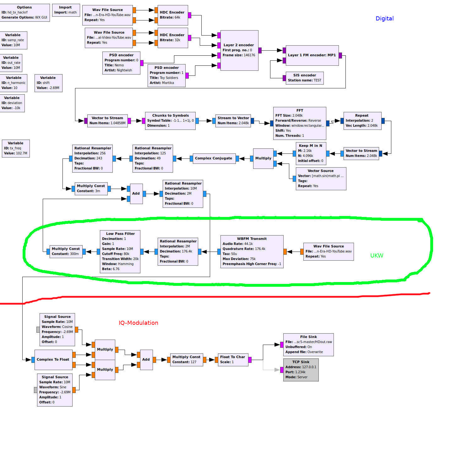 Der obere Bereich entspricht dem Digitalbereich. Hier werden die unterschiedlichen Radiosender oder Audiospuren zunächst in AAC+ mit iBiquity-Erweiterung codiert, das machen die HDC-Encoder Bausteine. Programmmetadaten werden durch die PSD-Bausteine bereitgestellt. Der so erzeugte Bitstrom durchläuft den Layer2-Encoder und wird dann mit Servicemetadaten Layer1 codiert. Anschließend erfolgt die OFDM-Signalerzeugung. Der mittlere grüne Bereich stellt einen kleinen analogen UKW-Sender dar. Beide Signale (analog+digital) werden addiert und auf Zielsamplerate 10MSps gebracht. Dort erfolgt auch die Trägergenerierung und die IQ-Modulation zur Erzeugung des eigentlichen Ausgangssignals. Die Ausgabe des berechneten Signals kann in Dateiform für fl2k_file erfolgen oder auch per TCP/IP an fl2k_tcp gestreamed werden. Die fl2k-Dienstprogramme füttern damit dann den DAC der USB3-Grafikkarte.