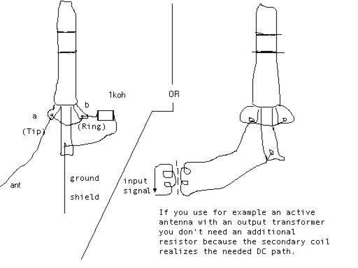 Wenn man also eine Loop nur für SW hat, dann nimmt man einen Stereo-Klinkenstecker, schließt die Loop an Masse und die Spitze an und läßt den Ring offen. Dann wirkt für LW,MW immer noch die interne Ferritantenne, für SW aber die LOOP. Soll die LOOP auch für MW,LW wirken, so hängt der Anschluß vom Ausgang der LOOP ab. Im einfachsten Fall, wenn die Loop einen für Gleichstrom niederohmigen Ausgang hat (z.B. massebezogenen Ausgangsübertrager oder Schleife direkt nach Masse) genügt es die Spitze und den Ring des Stereo-Klinkensteckers zu verbinden, damit die Antenne für LW-SW wirkt. Ist der Ausgang der LOOP gleichstrommäßig hochohmig (>1kOhm, kann man mit einfachem Ohmmeter messen), muß man zusätzlich von Ring und Spitze (die miteinander verbunden wurden) einen Widerstand von 1kOhm oder eine Spule/Drossel von ca. 0.3mH-1mH parallel nach Masse schalten (dies beeinträchtigt das HF-Signal nicht, da die Eingangsimpedanz des 909 bei etwa 300Ohm liegt). Sollte die Loop einen Verstärker enthalten, der am Ausgang Gleichstrom führt, so ist zusätzlich in Reihe ein Kondensator von 0.1µF (100nF) zu schalten.