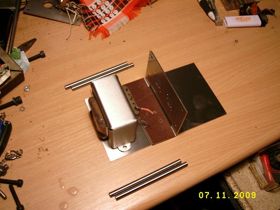 5. Grob zusammengestellt, mit Ausgangstrafo und 4 Distanzstäbchen die ich mir aus 6mm VA Rund gedreht und kopfseitig mit M4 versehen habe.