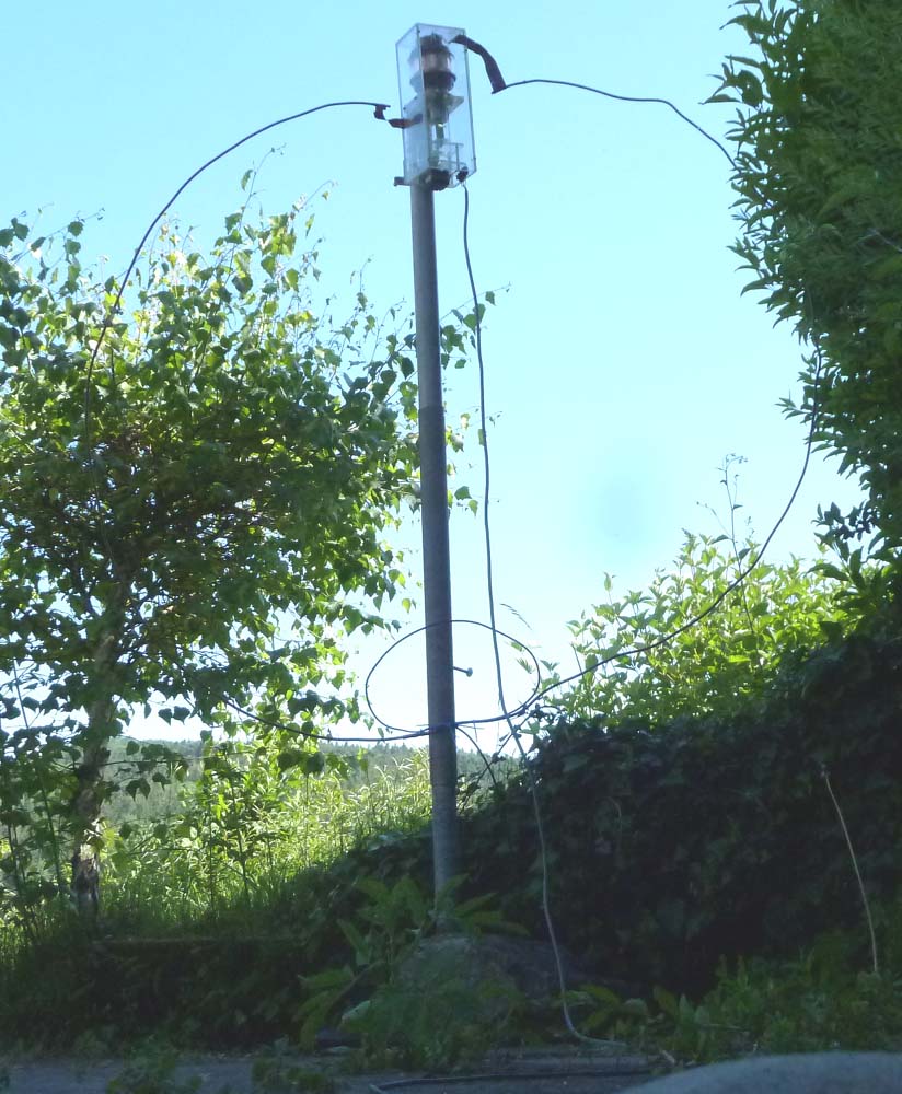 Damit das Ganze mechanisch robuster ist, steht die Antenne auf dem Kopf, also die Einspeisung ist oben und die Abstimmung unten. Elektrisch spielt die Ausrichtung keine Rolle, aber da der Vakuum-Drehko samt Antrieb und Gehäuse doch etwa 2kg auf die Waage bringt, habe ich den lieber unten. Nachteil ist, dass man im aufgerichteten Zustand nicht mehr an die Koppelspule kommt, und die muss man für gutes SWR abgleichen. Daher machte ich den Abgleich bei schrägstehender Antenne, so dass man an die Spule rankommt. Das sah dann ganz gut aus, aber nach dem Aufrichten ist das SWR mit etwa 3:1 schlecht bis miserabel. So muss ich wohl mit einem passenden Werkzeug von unten an der Spule rumbiegen, um zu sehen, wie die Korrektur etwa sein muss, dann die Antenne ablegen, korrigieren und wieder aufrichten. Da die Gewitter im Anflug sind, hat das noch Zeit.