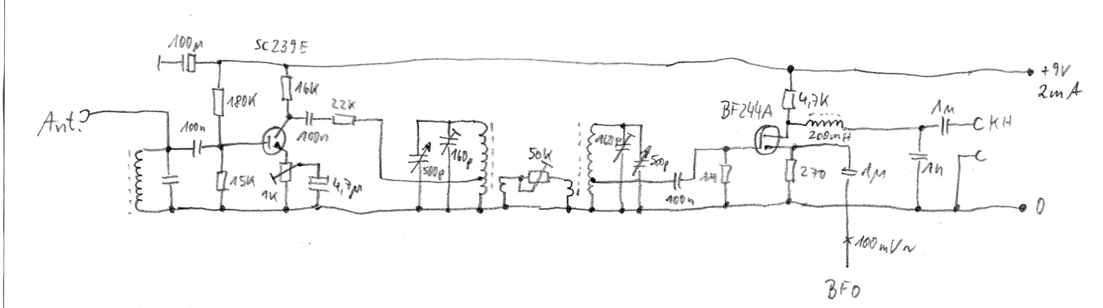 basteljero:Der nächste logische Schritt wäre für mich, die Mischung nicht im, sondern nach dem Audion in einer nachfolgenden Mischstufe durchzuführen und zu einer nachbausicheren Schaltung zu kommen. Denn man will ja einen einfach zu bedienenden Empfänger mit einer Art BFO haben und nicht im Gelände mit einem externen Sinus-Generator herumkaspern müssen.