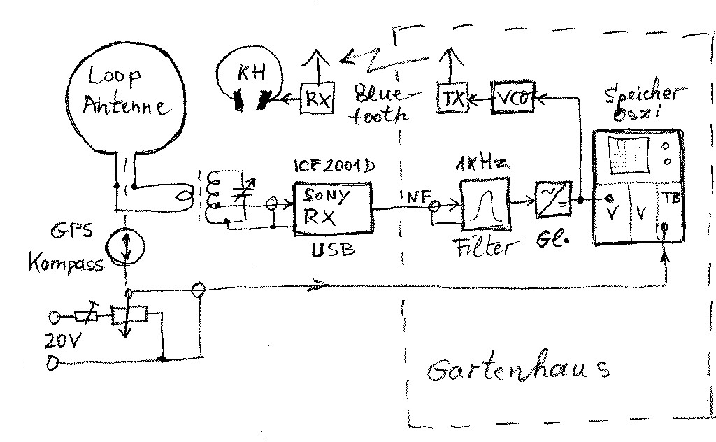 Mein schon vorgestellter Peilrahmen: link---- wurde mit einem GPS-Kompass erweitert. Damit sollte die magn. Missweisung kein Thema mehr sein. Weiterhin wurde zum besseren Auffinden des Peilminimums ein NF-Filter eingefügt. Der bereinigte 1kHz -Ton (ICF 2001D Stellung USB, Träger) wird gleichgerichtet und die gewonnene Gleichspannung auf den Vertikaleingang des Speicheroszilloskopes gegeben. Das alles steht abseits im Gartenhaus, ca. 3m von der Antenne entfernt.