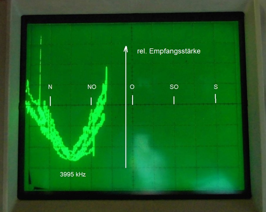 Um 09:15 Ortszeit den Sender Weenermoor auf 3995kHz angepeilt. Wider Erwarten konnte schon mit nur etwa 10 Peilungen ein deutliches Minimum sichtbar gemacht werden. Der Kompass zeigte die Richtung 18°, meine Einteilung auf dem Bildschirm NNO, was 22,5° entspricht. Der Unterschied kommt durch die nicht ganz genaue Eichung der X-Achse.... Kann man doch nicht meckern?