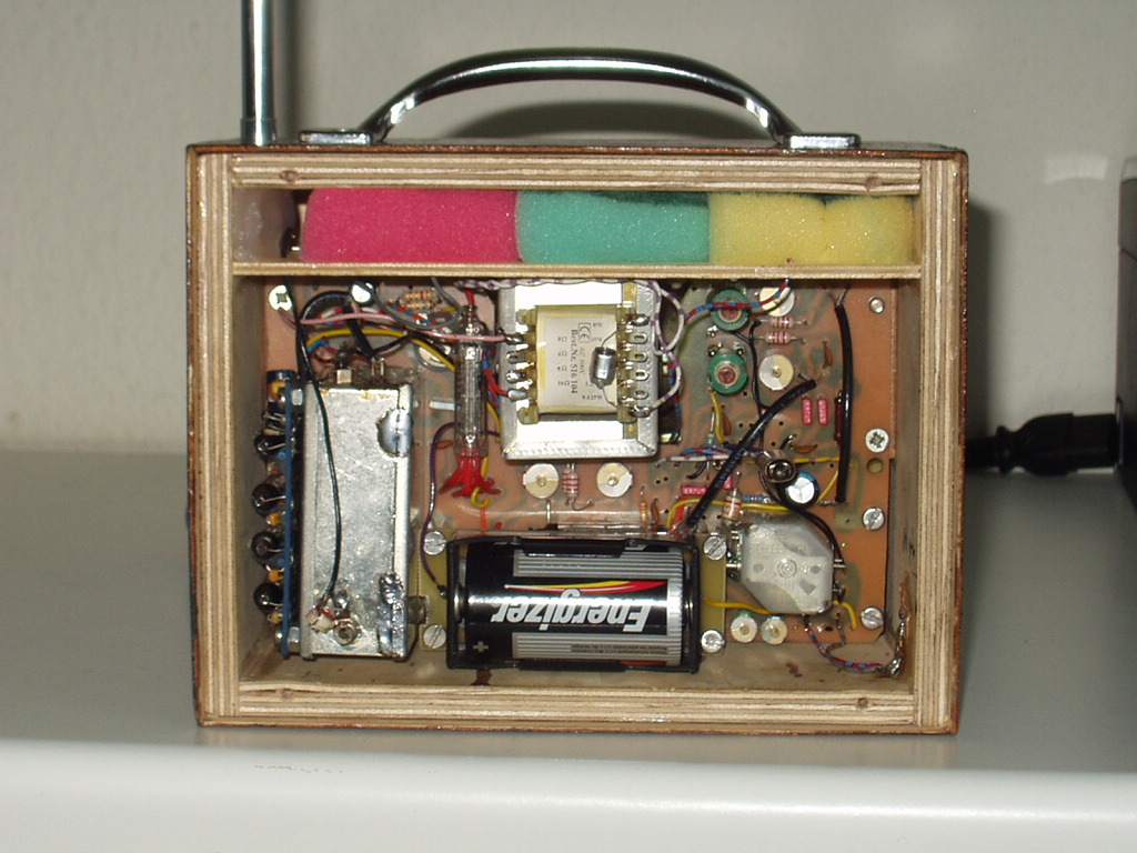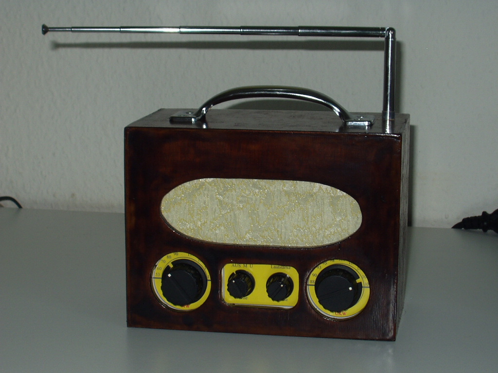 Ich hab ja vor, noch mal ein ähnliches Radio, nur etwas grösser zu bauen. Dieses soll dann die Art eines alten amerikanischen Weltemfängers bekommen. Die Rahmenantenne wird dann während des Betriebes hochgeklappt. Und es soll Loctalröhren bekommen (die gibt es noch preiswert zu erstehen).