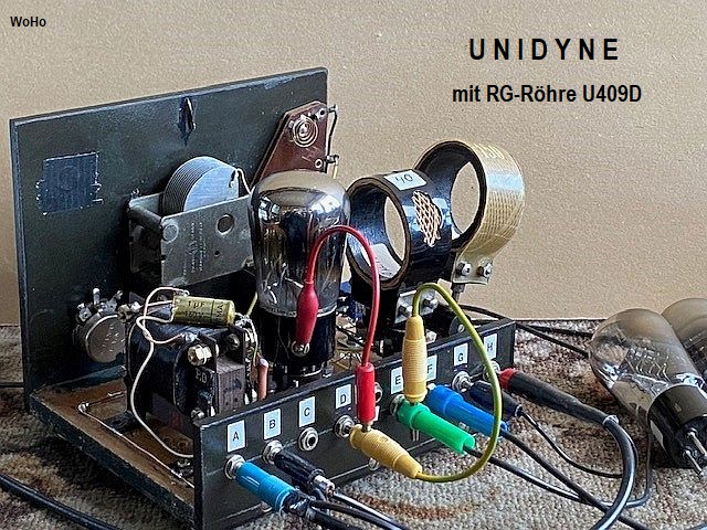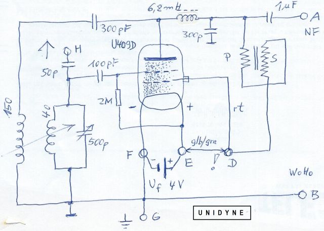 Der Pluspol E wird mit der Buchse D verbunden (grn-glb). Dann geht es über den als NF-Drossel geschalteten Übertrager zur Anode. Hat nichts mit der Funktion des UNIDYNEs zu tun. Bringt wohl eine bessere Basswiedergabe. Das Raumladegitter bekommt ebenfalls die volle Heizspannung über die rote Verbindung zur Seitenschraube. Der Rest ist wie üblich verdrahtet, wobei zu beachten ist, dass die Rückkopplungsspule gegenüber der Gitterspule viel mehr Windungen aufweist. Das war erforderlich, weil sonst keine ausreichende Rückkopplung zu stande kommt!