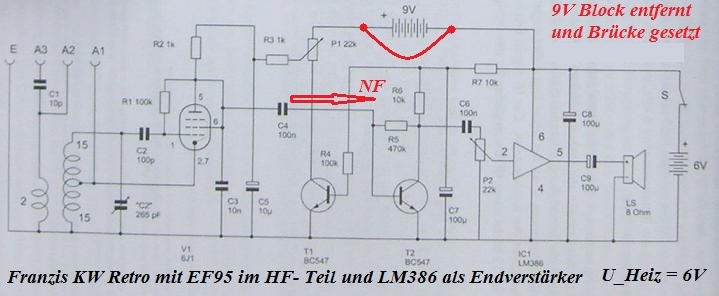 Gute Idee den T1 zu "beurlauben". Die Gitterkreisanzapfung ist allerdings bei der "kleinen"Platinenspule fest vorgegeben, die man per Eigenbau ersetzen könnte. Ich würde statt der 6 Volt die 9 Volt nutzen und dafür im Heizkreis einen Vorwidestand von rd. 17 Ohm knapp über 0.5 Watt einsetzen. Würde die Funktion der als Triode geschalteten EF95 merklich verbessern. Sicher halten die vier 1.5-Volt-Batterien wegen des höheren Strombedarfs länger durch, als der 9-Volt-Block, was ohne Langzeitnutzung kaum problematisch ist. Bei Bedarf hilft auch noch ein kleines 9 Voltnetzteil, mit einem zusätzlich großen Siebelko.