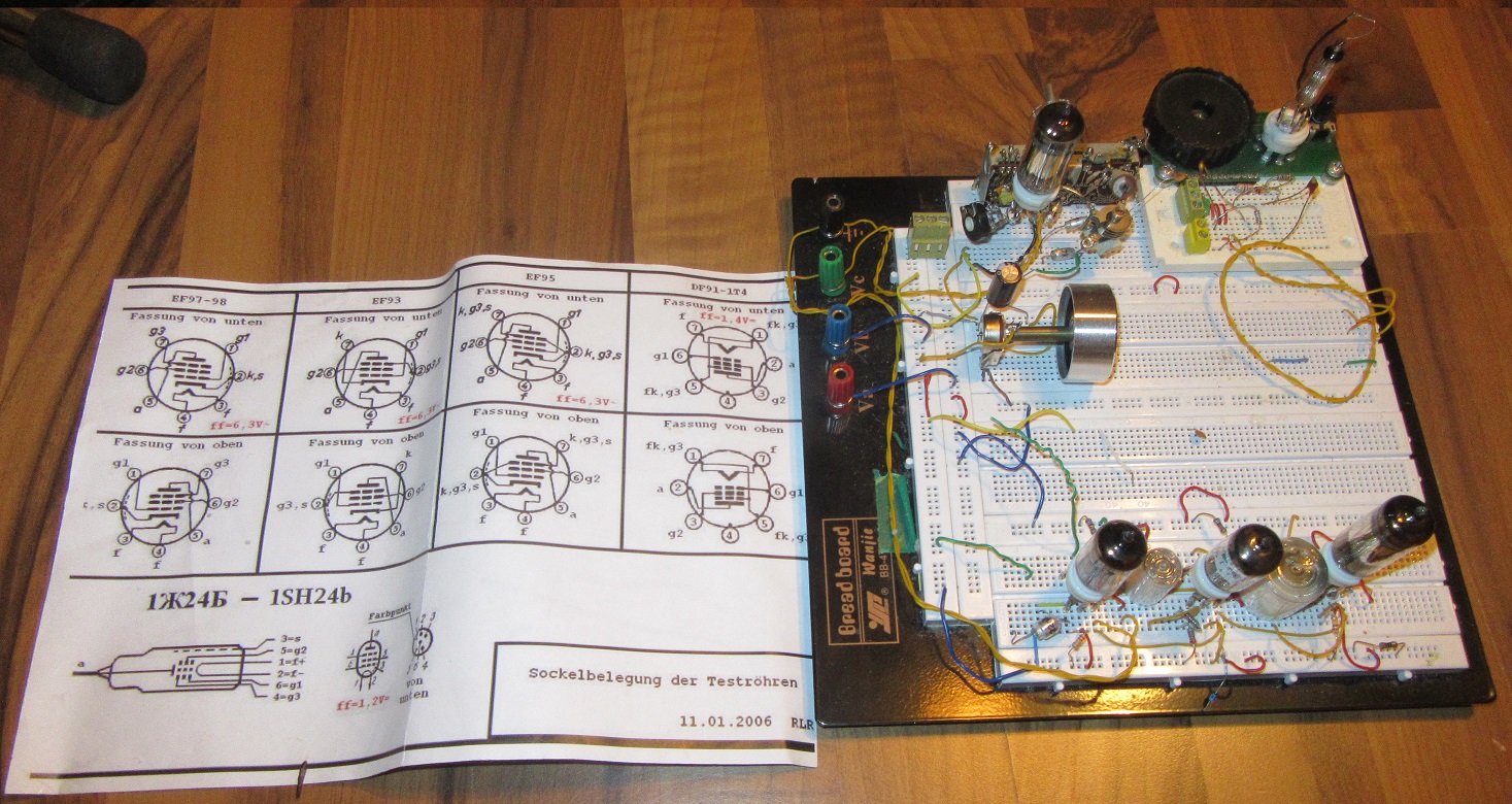 das Konzept die Heizspannung einer Röhre auch für die Anode zu nutzen wird ja sehr erfolgreich bei den AK- Modul- Bus- Experimentiersystemen RT 25 und RT 100 eingesetzt. Beim Aufbau mit max. 6V funktioniert die EF98 echt prima.... hat allerdings auch einen enormen Heizstrom und ist daher für einen reinen Batteriebetrieb aus meiner Sicht eher ungeeignet. Bei Experimenten mit EF95 (6J1) wird die Anodenspannung auf 12V gesetzt. Es werden dafür einfach zwei Röhren mit ihrer Heizung (f) in Reihe geschaltet. Ein einfacher Trick, der bei Verwendung mehrerer Röhren die mögliche Anodenspannung nach oben treibt. z.B. Kosmos Radiomann auf B.Kainka.de