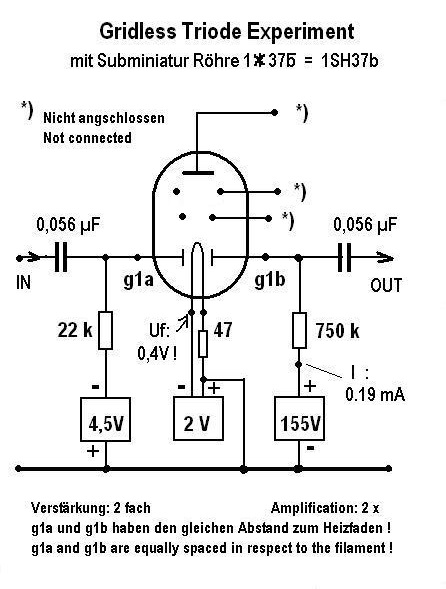 Dann habe ich noch nach anderen Röhrentypen gesucht, wo zwei gleichwertige Elektroden um den Heizfaden angeordnet sind. Gefunden wurde die russische Subminiaturröhre 1SH37b (1j37b):