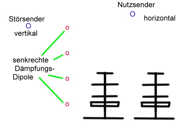 Man könnte auch versuchen, dem Störsender in seiner Polarisationsrichtung Energie zu "stehlen" mit in dieser Ebene aufgehängten Dipolen an zur Impedanz passenden "Last"-Widerständen. Mit mehren solchen Dämpfungs-Antennnen in Nähe der Nutzantenne habe ich mal experimentiert und Dämpfungseffekte beobachtet. Die Nutzpolarisation wird auch hier 20 dB weniger bedämpft.