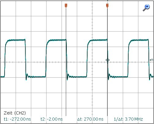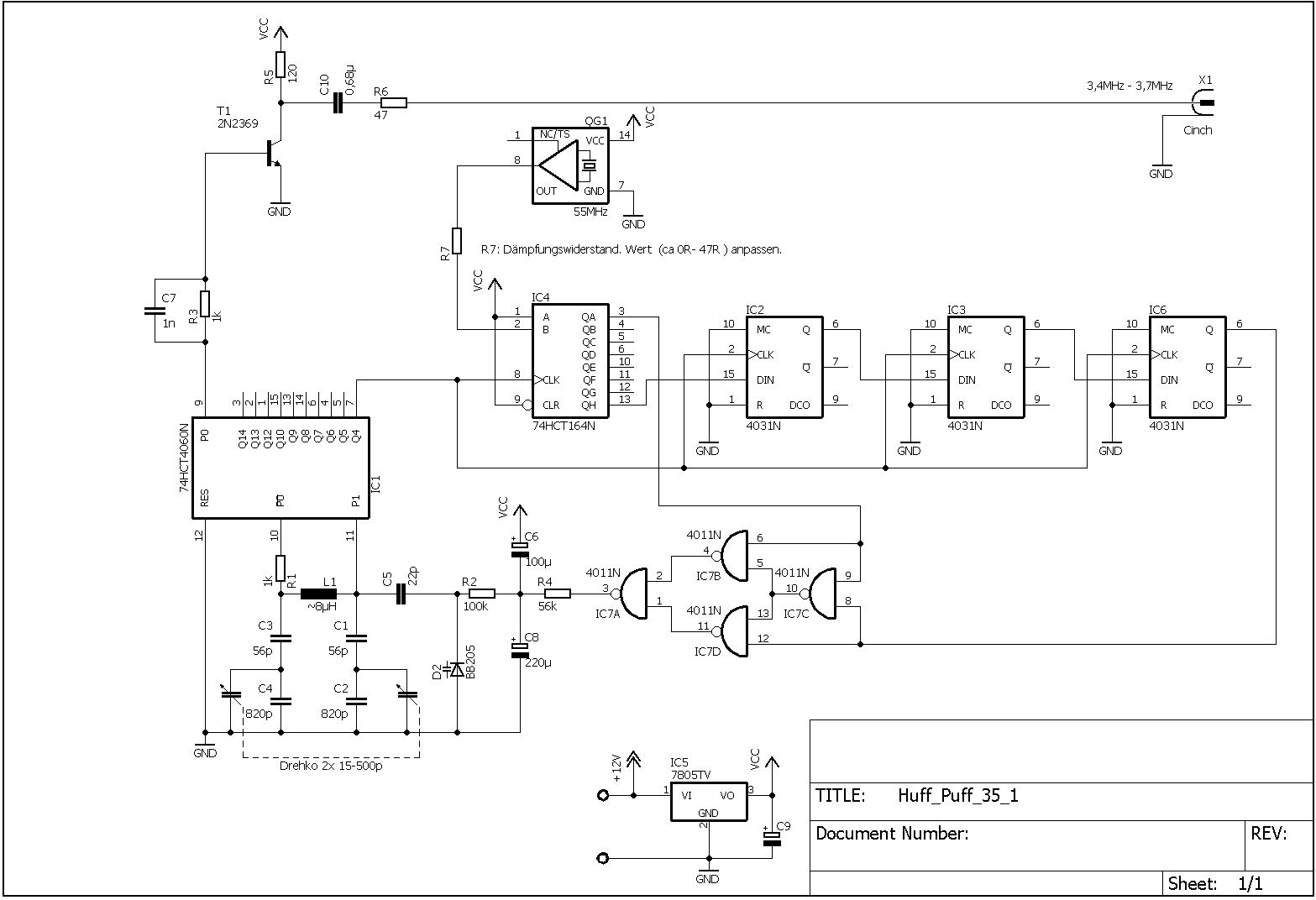 Der Oszillator liefert eine symmetrische Rechteckspannung im Frequenzbereich von 3,4-3,7MHz. Die Abstimmschrittweite beträgt ca 68Hz im unteren Frequenzbereich, ca 81Hz im oberen Frequenzbereich.