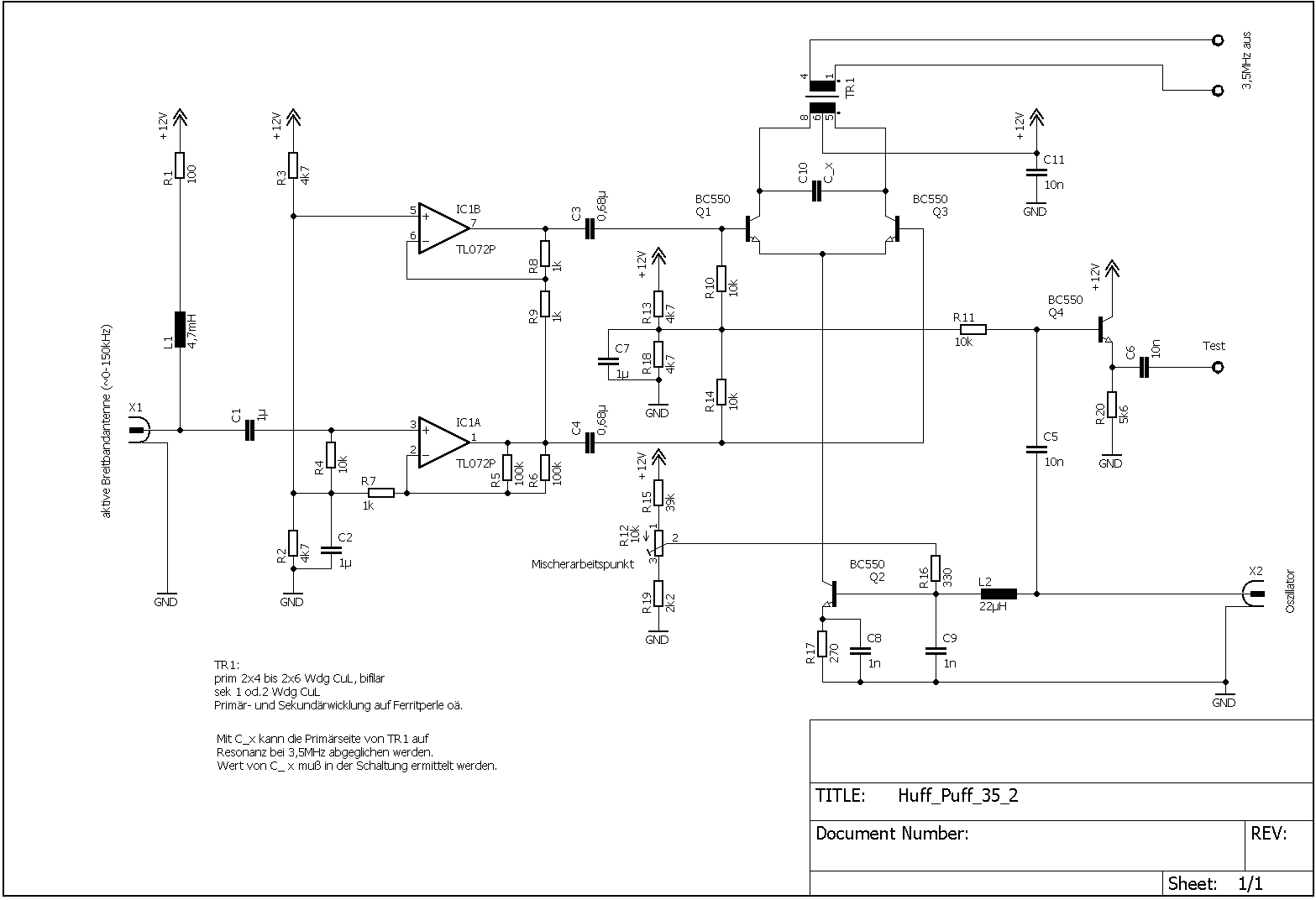 Die aktive Antenne wird vom HF-Teil aus mit Spannung versorgt, die von der Antenne angelieferte Signalspannung etwas verstärkt und in zwei komplementäre Pfade aufgespalten. Diese werden einem Balancemischer zugeführt und auf 3,5MHz umgesetzt, sodass sie mit einem nachgeordneten Radio empfangbar sind.