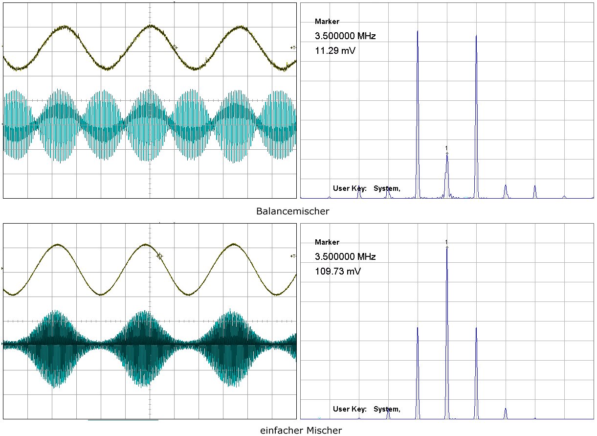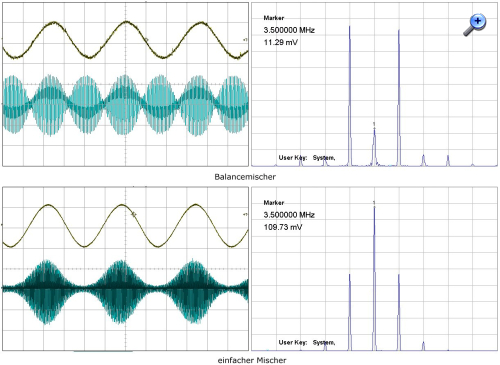 Im folgenden Bild ist die Umsetzung eines Testsignals sowohl durch einen Balancemischer als auch durch einen einfachen Mischer gegenübergestellt. Zur Verdeutlichung ist die vertikale Teilung in den Spektrogrammmen linear, nicht logarithmisch gewählt.