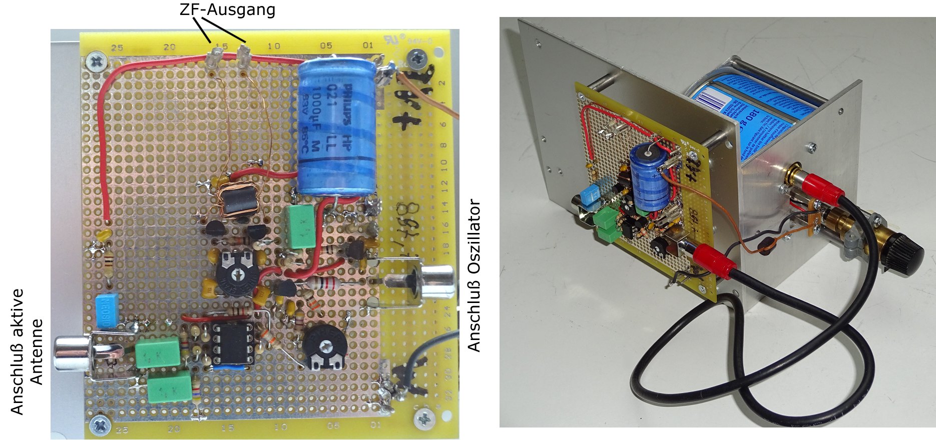 Um die Betriebssicherheit der Schaltung zu verbessern ist sie auf einer HF-tauglichen Lochrasterplatte aufgebaut und in einem Metallgehäuse montiert. Die Abstimmung des Oszillators erfolgt durch einen hochuntersetzenden Feintrieb.