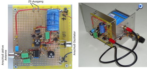 Das HF-Teil ist, ebenso wie der Oszillator, auf einer HF-tauglich Lochrasterplatine aufgebaut und mit dem Oszillator zu einer mechanischen Einheit zusammengefasst welche von einem externen Netzteil mit Spannung versorgt wird. Am im Schaltbild eingezeichneten Testausgang steht das Oszillatorsignal für die Auswertung durch einen Frequenzzähler zur Verfügung.