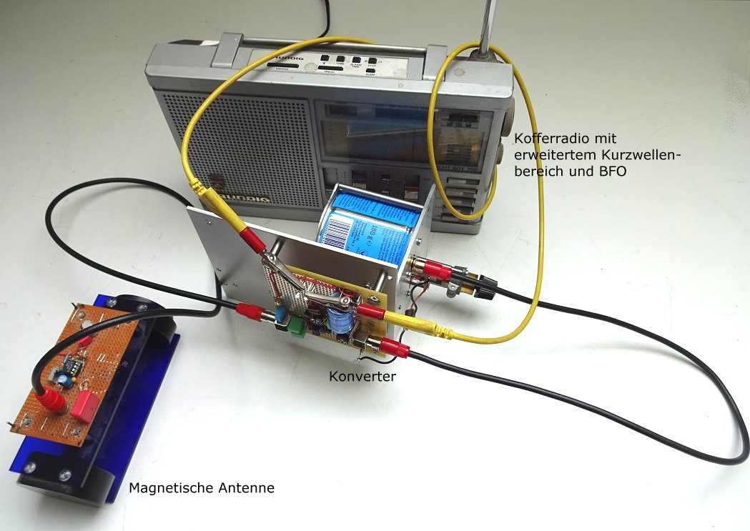 Im folgenden Foto ist die komplette "Empfangsanlage" abgebildet. Deutlich ist das (gelbe Labor-)Kabel zu erkennen, mit dem das Mischersignal zum Radio übertragen wird.