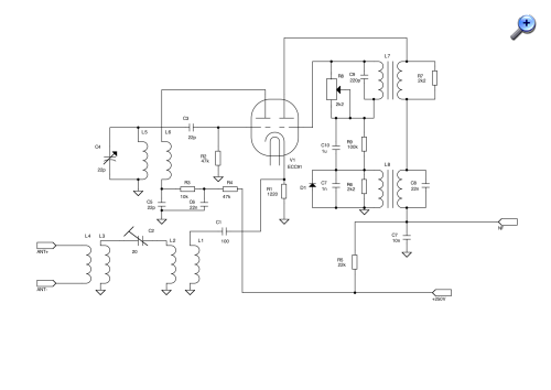 L7 bildet zusammen mit C9 den 3MHz-Schwingkreis für den eigentlichen Pendel-Oszillator. Mit R8 wird die Dämpfung und damit das Abklingen der Pendelschwingung eingestellt, so dass sie in der Sperrphase der Röhre komplett abklingt. R7 dämpft die Rückkopplungswicklung und unterdrückt so parasitäre Resonanzen durch die Streuinduktivität.