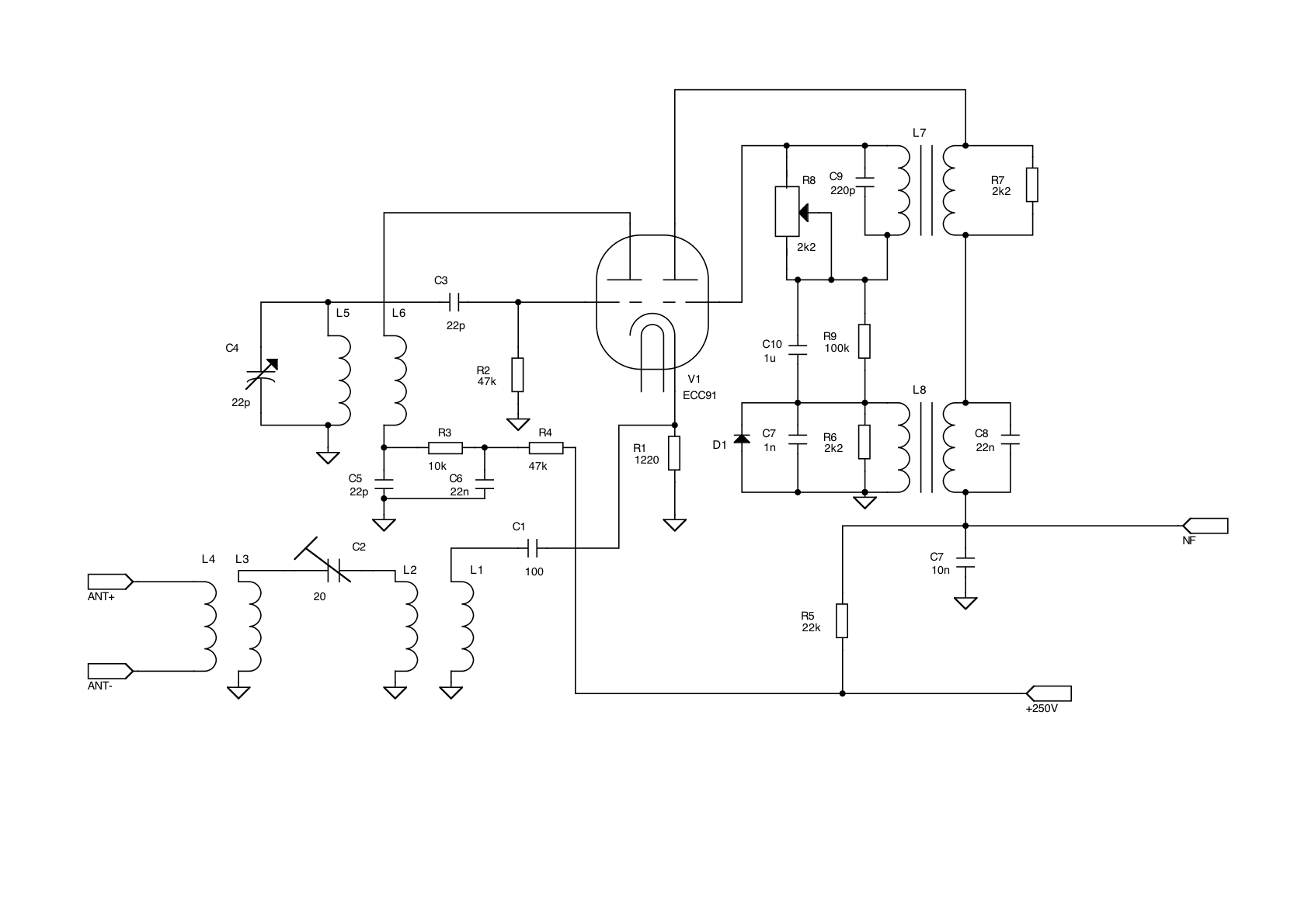 in der Zeitschrift "Funk-Technik" Nr.2/1958 hatte ich vor längerer Zeit einen Artikel über einen neuartigen Pendelempfänger entdeckt. Der tönte so gut, dass es nicht wahr sein kann... daher habe ich ihn nachgebaut und entmystifiziert. Hier die nachgezeichnete Schaltung des relevanten Teils: Die linke Triode der ECC91 ist dabei ein normaler Oszillator, während die rechte Triode den eigentlichen Pendelempfänger bildet, der auf eine fixe Frequenz von 3MHz abgestimmt ist. Mit dem Oszillator wird die Empfangsfrequenz auf die 3MHz runtergemischt, es ist also ein Superhet. Die Hochfrequenz wird über das Anpass-Netzwerk aus L1..L4 in die Kathode eingespeist, dieses sorgt dafür, dass kein 3MHz-Signal von der Antenne reinkommt. Hier ist schon die erste massive Schwachstelle: An der Kathode liegt unter anderem das Oszillatorsignal mit einem Pegel von etwa 0dBm, also etwa 1mW Leistung, die über die Antenne abgestrahlt wird, was ernsthafte Konsequenzen zur Folge hat, wenn man das so betreibt. Dass das so ist, ist eigentlich klar, an der Kathode liegt ja die HF vom Oszillator, die Triode liefert als Kathodenfolger die Spannung niederohmig.