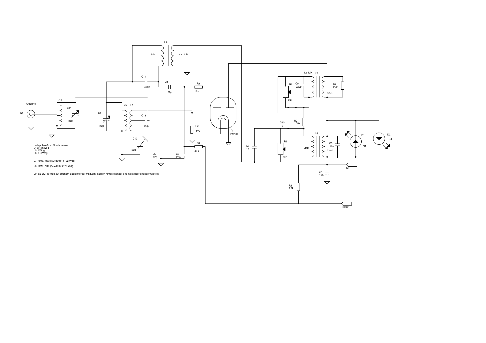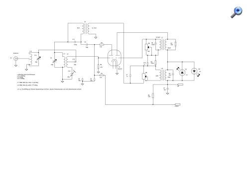 Fazit: Durch die Verwendung der linken Triode als Mischer konnte die Empfindlichkeit erhöht und die Abstrahlung massiv reduziert werden, so dass der Empfänger grundsätzlich betriebsfähig wird. Durch den 3MHz-Koppelkreis L9 wird bei entsprechendem Abgleich die Flankendemodulation sauberer, wenn man die Resonanz gegenüber dem Pendelkreis etwas versetzt.
