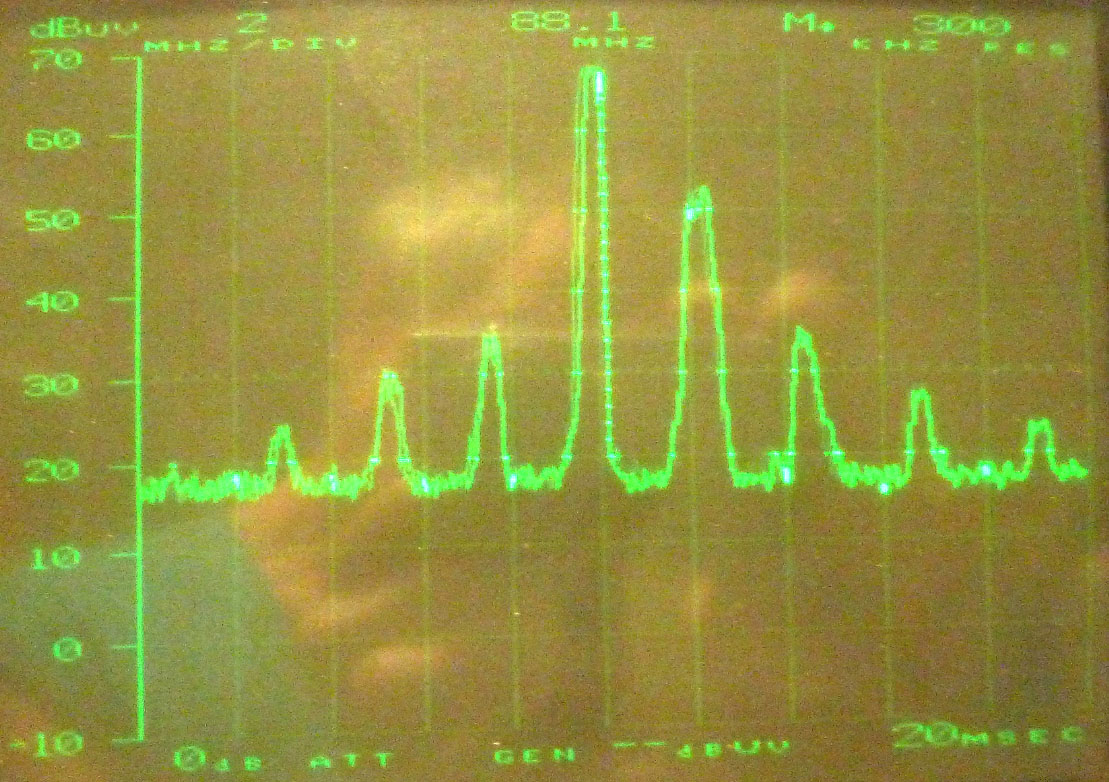 Die Abstrahlung des Oszillatorsignals ist noch zu hoch, könnte aber durch einen HF-dichten Aufbau in den legalen Bereich gebracht werden (damals <1mV, entspricht <60dBuV). Neben dem Oszillatorsignal gibt es auch die durch 'Rückwärtsmischung' hochgemischte 3MHz samt Oberwellen. Der additive Mischer funktioniert nämlich in beide Richtungen, was damals schon bekannt war und normalerweise auch nicht stört, aber hier wird die 3MHz-Störung hochgemischt, wie man im Spektrum sieht.