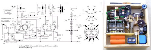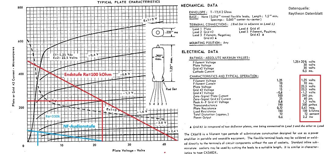 Die DL651 ist hier durch die 6418 ersetzt, die etwas abweichende Kennlinien besitzt und umgekehrte Heizfaden-Polarität. Alternativ könnte die leistungsfähigere 6088 eingesetzt werden. Denn der Anodenstrom der 6418 beträgt typisch 240µA, 2,5 mW sind nach Datenblatt erzielbar. Für NF-Vorverstärkung ist die Röhre nicht vorgesehen.