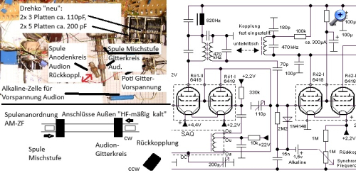 Ergebnisse: - Als ZF-Verstärker verstärkt die 6418 bei 17V Anoden-Betriebsspanung mit dem unverändertem 470kHz-Kreis mindestens 8-fach. (Die Resonanzfrequenz war 400 kHz im Aufbau) - Die Mischverstärkung ist etwa 6-fach. Nach dem zweiten Kreis des ZF-Bandfilters noch 3- bis 4- fach. Das wird dann durch die Entdämpfung der Audion-Röhre später mehr als kompensiert, 10- bis 20- fache Stufenverstärkung sollte so erzielbar sein. - Die Windungszahl der Gitterspule war etwa 1/3 der abgestimmten Anodenkreisspule, es ist da also noch etwas Luft hin zu höheren Frequenzen. - Die Gitterkreisspule sollte verschiebbar auf der abgestimmten Anodenkreisspule angebracht sein, damit optimale Amplitude eingestellt und Überschwingen durch zu feste Kopplung verhindert werden kann.