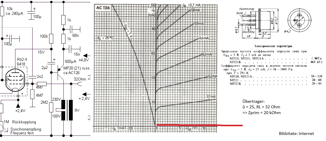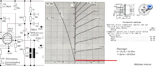 So wird es denn ein Hybrid werden, der schwebte sowieso schon lange vor. Selbstverständlich mit zeitgemäßem Transistor, der Russische MP20 entspricht laut RFT-Vergleichsliste dem AC126 und wurde wie der ab etwa 1960 produziert.