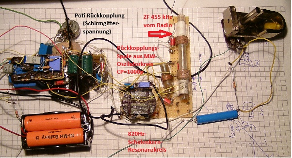 - Der Anodenwiderstand musste auf 100 kOhm herabgesetzt werden, um mit der Spulen- kombination im Bild Rückkopplung zu erzielen. Getestet wurde auf 648 kHz, da kommt Freitag nachts immer Rob van Dijk auf Caroline.