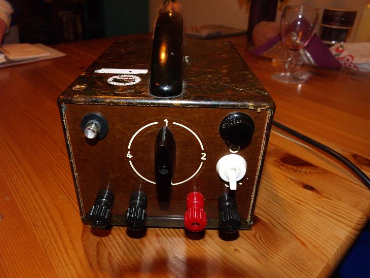 Nun habe ich mir ein einfaches Netzteil mit Trafo gebaut und nutze den 6VAC Abgriff direkt als Heizkreis und die Gleichrichtung, stilecht mit einer EZ80 ( Tipp aus dem Forum ). Damit ich nicht im freien Aufbau eine gefenstert bekomme, habe ich das ganze.... etwas überdimensioniert, in ein altes Hartpapiergehäuse, aus der Schrottkiste, gebaut.