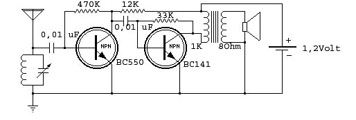hier ist das Schaltbild, genau wie ich den Empfänger aufgebaut habe. Ein paar kleine Veränderungen. Das Radio ist bisschen leiser, klingt aber viel besser und ist viel empfindlicher als sein Vorgänger. Die Widerstandswerte wurden experimentell ermittelt, das Radio funzt noch gut mit nur 1,2 Volt, cool.