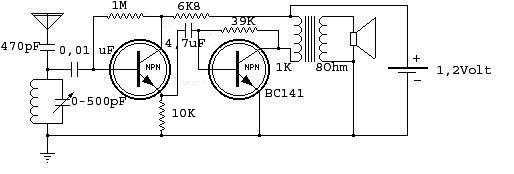 Hier is das leicht veränderte, verbesserte Schaltbild, ein 470 pF Kondensator in der Antennenleitung und ein 500 pF Luftdrehkondensator macht das ein komplettes Mittelwellenradio mit guter Klangqualität. Na ja, mit 12 Meter Außenantenne geht jedes Radio gut. Ichj moechte gerne ein zwei Transistor Radio bauen, das wirklich gut geht, die Japaner waren da gut, denn die waren irgendwie Steuerfrei zi importieren in die USA, aber ich kann kein brauchbares, leicht zu kopierendes Schaltbild finden.