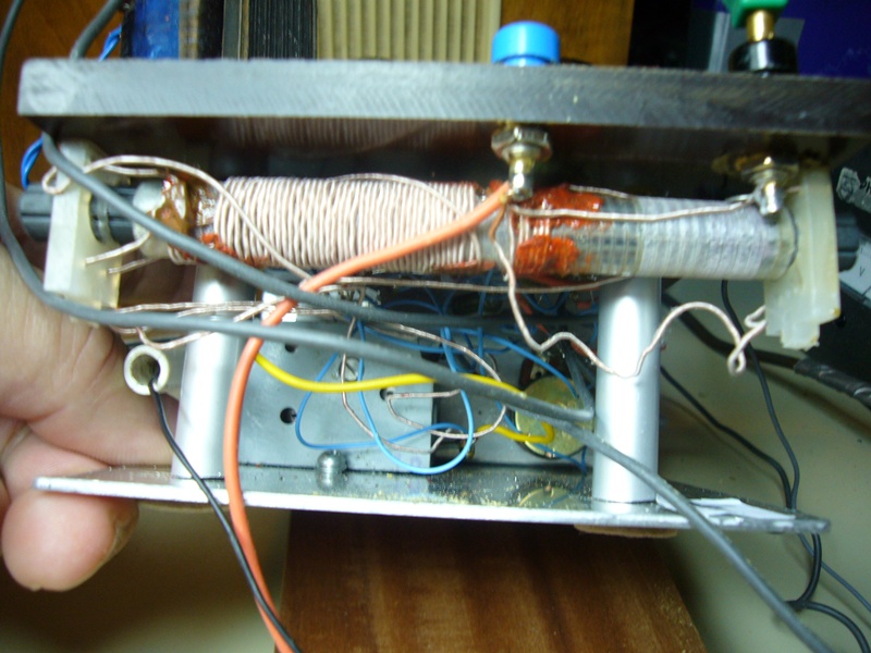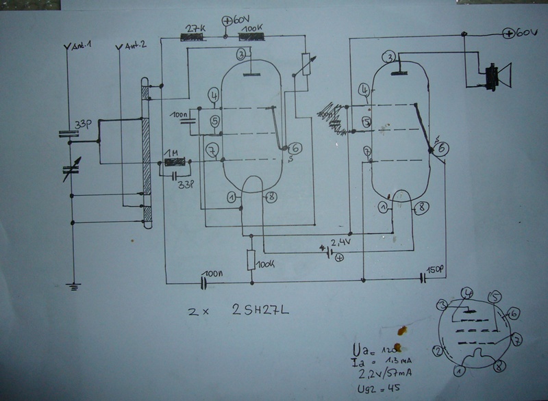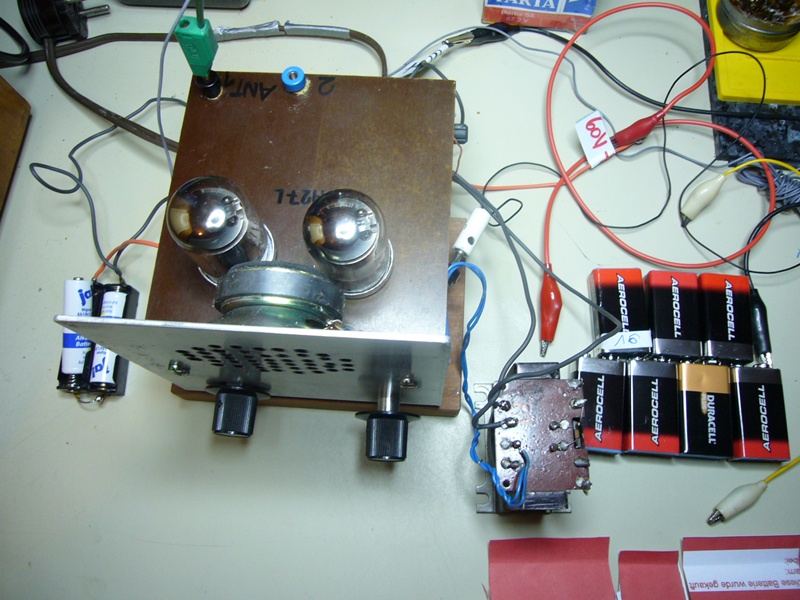 Vielen Dank an für die Antworten und vor allem den sofortiger Erfolg dadurch. Den Aufbau hatte ich schon vorbereitet. Jetzt ging es an das Verdrahten. Als erstes habe ich gleich die Heizung Parallel geschaltet. Die Masseverbindung mit minus Heizung (2 x 1,5 Volt) der Batterie, sowie Minus-Leitung der Anodenspannung verdrahtet. Als Spule habe ich einen Ferrit Kern verwendet mit 13 cm Länge, 1 cm Durchmesser. Darauf sind Antenne 3 Windungen, dann 40 Windungen und 4 Windungen Antenne 2 , gegen Masse (Erde). Seide umsponnene Litze war noch vorhanden.