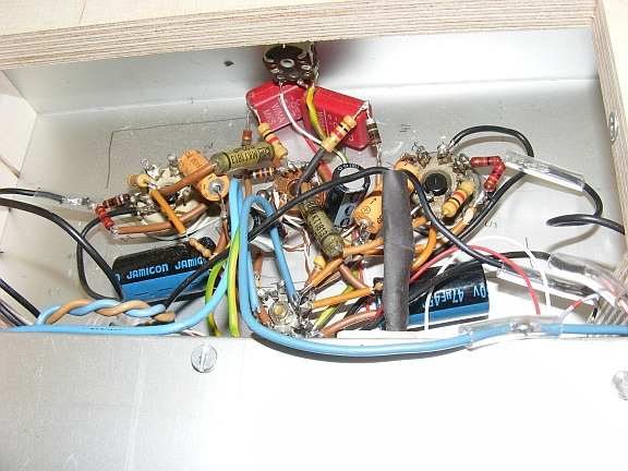 Vielen Dank für Euere ehrlichen Meinungen. Nun möchte ich noch einige Bilder vorstellen, sowie die Schaltungen. Nach meinem Kenntnis und momentanem Wissenstand habe ich die Schaltung angefertigt. Lieber einen dickeren Draht verwendet als gespart. Heizleitungen und die Leitungen zu den Lampen die Wechselspannungen führen habe ich verdrillt. Die ganze Anlage arbeitet absolut ohne Brumm. Nur wenn man das Ohr an die Lautsprecher drückt ist ein fernes ,ganz leises Summen zu hören. Massesternpunkt ist vorhanden. Die Koppelkondensatoren sind MKS und MKT, was ich gerade hatte. Die Folie habe ich beschrieben, sie hat einen perlenartigen, transparenten Schimmer. Ein ganz dünnes Alublech erhöht die innere Reflexion des Lichtes. Das Dach meiner Konzerthalle besteht aus Resopal, das gibt es übrigens in allen Farben. Was ich benutzte past halt zum Holzkorpus. Es wurde mir geschenkt. Einem geschenkten Gaul, schaut man nicht ins Maul. Doch Euere Kritiken bestätigen meine Entscheidung. Alle Holzteile in Schwarz wäre auch denkbar gewesen. Aber was sollen alle Verzettelungen ums Aussehen. Hauptsache die Musik spielt.