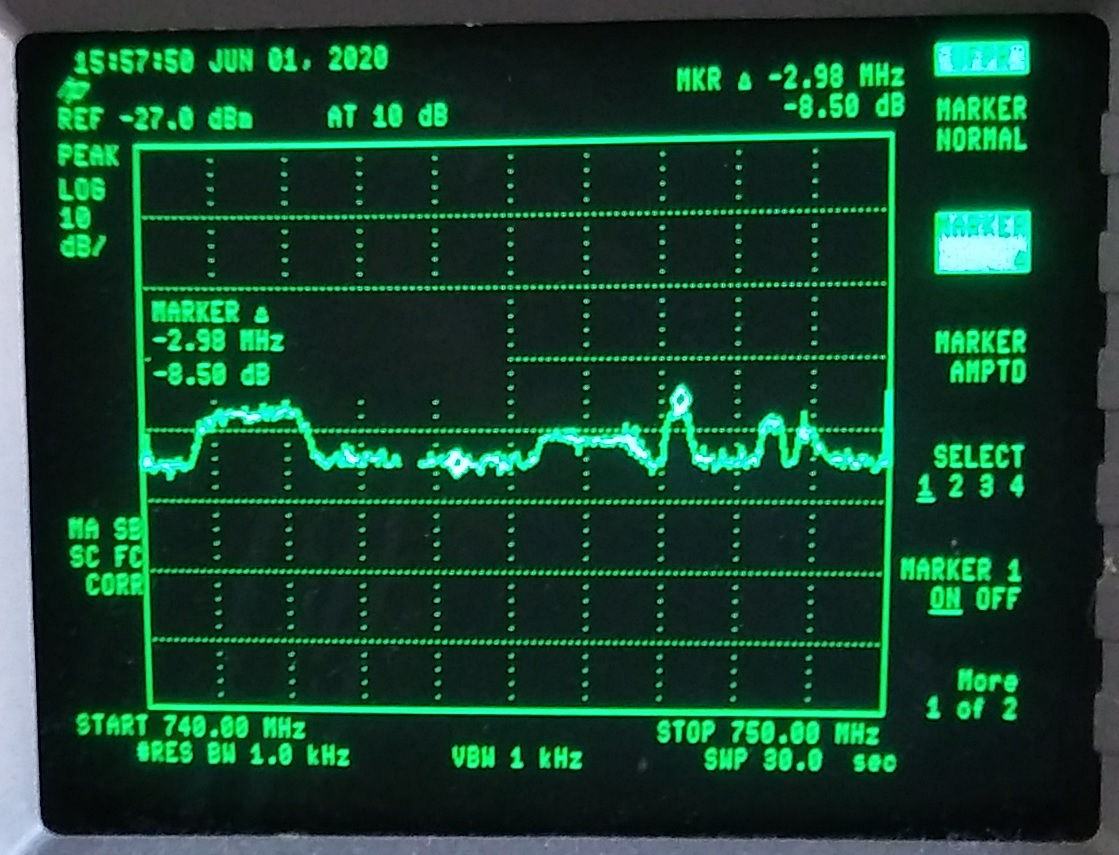 Noch einmal zur Leistung: Es wird empfohlen, 2W der Senderantenne zuzuführen. Schon bei nur wenigen Metern Koaxkabel muss man aber davon ausgehen, dass mindestens die Hälfte der Leistung auf dem Kabel verloren geht. Diese Leistung aus der CDMA-Endstufe zu beziehen ist zwar kein Problem, aber der Umbau braucht auch noch seine Zeit. Wahrscheinlich werde ich einen zweiten Adalm-Pluto an der Dummyload über ein 50dB Dämpfungsglied als Spektrumanalysator anschliessen, denn mein hp geht nicht über 2GHz hinaus.