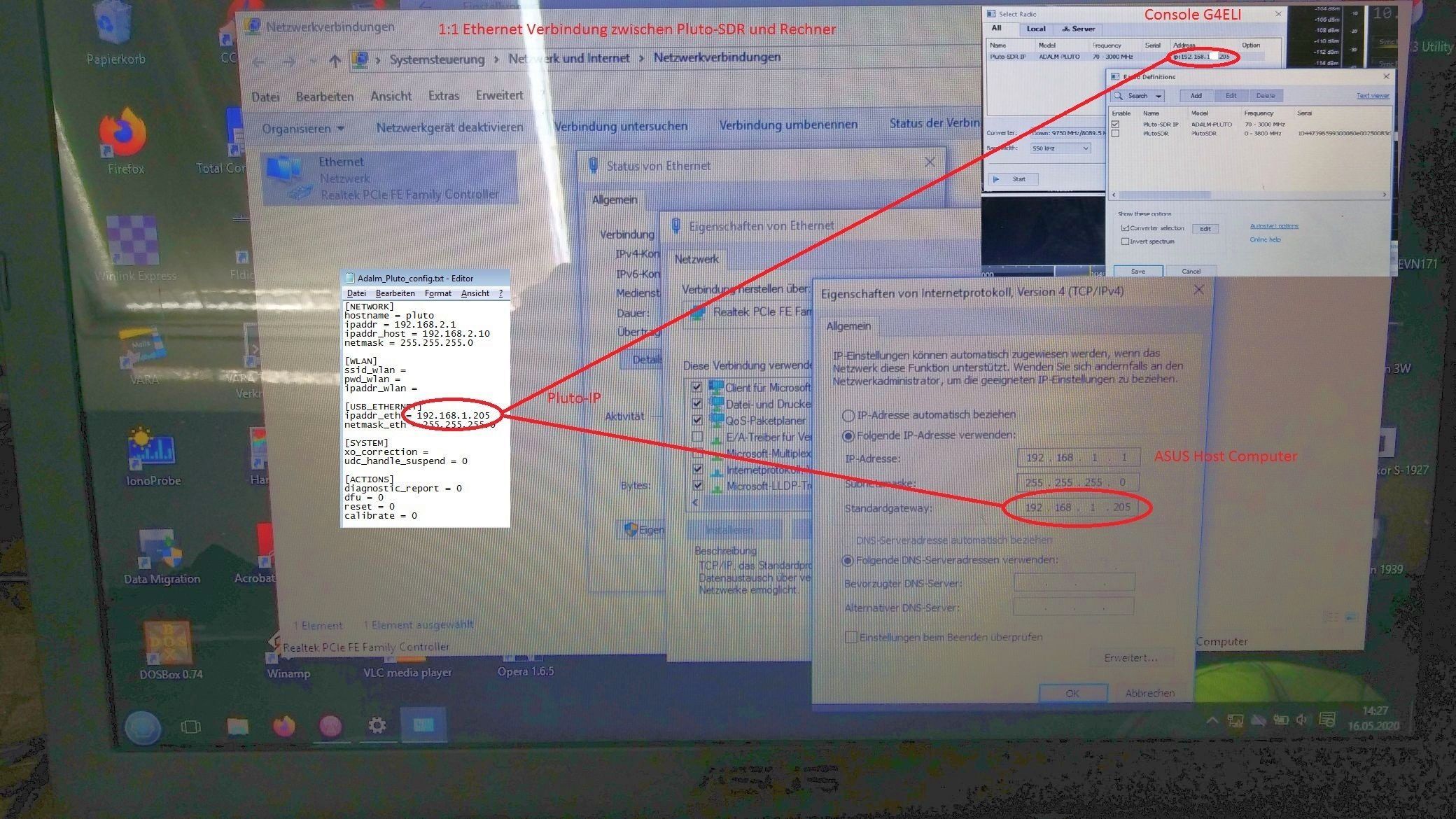 Kernstück ist der "Adalm-Pluto" von Analog Devices, der zunächst an einem PC an einer USB-Schnittstelle angeschlossen wird. In der Datei config.txt, in der die Umgebungsvariablen des Linux-Systems stehen, muss für eine direkte IP-Verbindung (über eine sog. ICY-Box) die Variable ipaddr_eth einer festen IP Adresse zugewiesen werden: