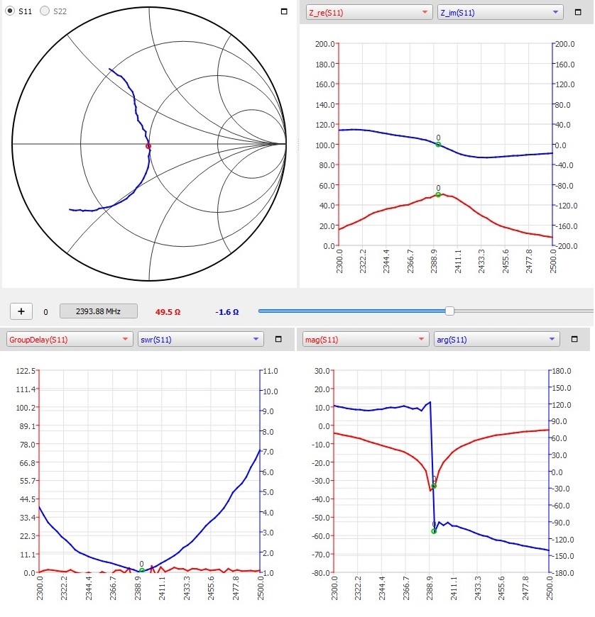 dem Aufsatz von Gunthard Kraus folgend, habe ich mit den Patchantennen ein wenig experimentiert. Meine Schlussfolgerung ist, dass sich Platinenmaterial für eine Patchantenne nur eingeschränkt eignet. Die Abmessungen werden so klein, dass man mit einer feinen Nadel die Ätzkante der Platine (hier 30 x 30mm) zum Abgleich immer nacharbeiten muss. Die Antenne ist exrem schmalbandig, sodass die beiden Peaks fast auf einer Frequenz zusammen fallen. Damit ist die Erzeugung einer zirkularen Polarisation höchst ungewiss. Man benötigt auf jeden Fall einen VNA. Aus Kostengründen habe ich in China einen SAA2 bestellt, mit dem man sich auch behelfen kann.
