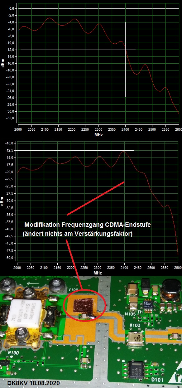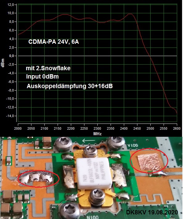 Obwohl immer noch eine korrekte Messung der Ausgangsleistung fehlt, stelle ich fest, dass die CDMA-Endstufe ab 8A Stromaufnahme die Ausgangsleistung abregelt. Das kommt natürlich besonders zum Tragen, wenn der Frequenzgang durch "Snowflaking" korrigiert wurde. Stecker werden heiss, die 3m Aircell 7 und Patch handwarm (ca. 1,5 dB Dämpfung, liesse sich noch halbieren).