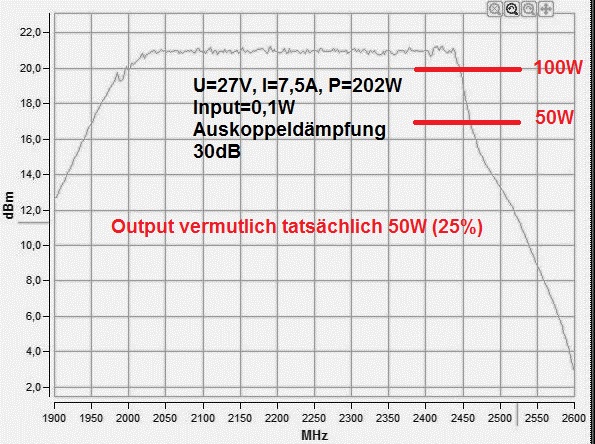 die Korrektur des Frequenzgangs der CDMA-Endstufe verlief positiv, obwohl ich die Notwendigkeit etwas in Frage stelle. Die Experten nennen das "Snowflaking". Es ist erschreckend, was eine etwa 4x4 mm grosse Kupferfolie "anrichtet". Der Adalm-Pluto mit maximaler Trägerleistung und ohne weiteren Verstärker kann nun einen Endstufenstrom von über 6A erzeugen, was einem Input von 144 Watt entspricht. Die Ausgangsleistung wurde auf eine Weinschel Dummyload 53-30-33 (500W, spezifiziert bis 2,5 GHz) gegeben, die eine Auskoppeldämpfung von 30dB hat. Der Empfänger des Adalm-Pluto wurde mit einem Dämpfungsglied von 10dB versehen. Ich gehe trotzdem davon aus, dass man so nicht auf die Ausgangsleistung schliessen kann, die ich auf 20 Watt schätze. Verwendet wurde das Programm Satsagen. Entweder der Auskoppler und/oder das Aircell7-Koaxkabel verfügt über eine ausgeprägte Welligkeit. Mit mehr als 15% Wirkungsgrad ist ohnehin nicht zu rechnen. Sch... Mobilfunk...