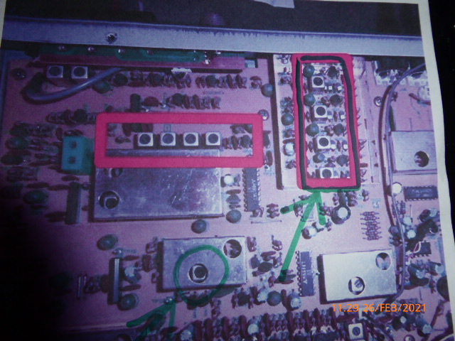 da ich bei meinem Yaesu-8088 auch das Problem mit einem blinkenden Display hatte habe ich zunächst nach der Methode wie oben von Georg beschrieben versucht dies zu beheben. Das funktionierte auch mehr oder weniger, habe dabei aber feststellen müssen dass das Blinken abhängig ist von der jeweils am VFO eingestellten Frequenz. D.h. wenn ich z.B. bei 6 MHz die Spulen solange verstellte dass das Blinken aufhörte und ich dann meinetwegen auf 21 MHz wechselte das Blinken wieder anfing. Habe mir dann das Service Manual heruntergeladen und dort die Lösung des Problems gefunden. Hierin findet sich eine genaue Einstellanleitung für die 4 Trimmer-Spulen welche ich hier kurz beschreiben möchte: Neben Einstellwerkzeug für die Trimmer benötigt man lediglich ein Voltmeter mit ausreichender Genauigkeit. Jede der 4 Trimmer-Spulen ist bei einer bestimmten Frequenz so einzustellen dass sich am Messpunkt TP2001 jeweils ein Wert von 14 V DC (+-0,2V) gegen Masse ergibt. TP2001 befindet sich direkt unterhalb des silbernen Abschirmgehäuses mit den 4 Trimmer-Spulen. Nachfolgend die am VFO einzustellenden Frequenzen für den Abgleich der 4 Trimmer-Spulen: (im Foto von oben nach unten gesehen)