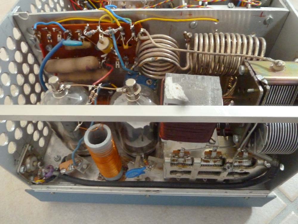 Das Gerät vereinigt so ziemlich alles an Technologie, die damals auf breiter Ebene verfügbar war: Neben 9 Röhren, zahlreichen Transistoren und ein paar ICs hat es auch einen Mikrocontroller samt alphanumerischem LCD für die Steuerung und Bedienung des Geräts. Hier der Ist-Zustand: