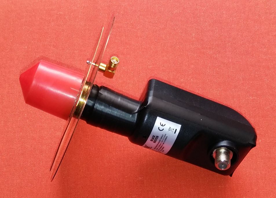 Der gezeigte LNB ist ein "Red Eagle Black Buster Single LNB" mit Rundhohlleiter und aufgesetzter Plastiklinse, der die Integration der Uplink-Patchantenne erlaubt. Zur Verbesserung der Frequenzstabilität wurde der 25 MHz Quarz zur Erzeugung der Misch- frequenz 9750 MHz durch einen TXCO der Firma TXC CORPORATION Typ 7P-25.000MBP-T mit einer Frequenzstabilität von +/- 280 ppb im Temperaturbereich von - 40 bis + 85°C ersetzt. Der TXCO ist genauso teuer wie der LNB, man erreicht aber eine absolut ausreichende SSB-Stabilität für den Nachsetzer auf 740 MHz (im einfachsten Fall ein RTL Stick der Version 3). Die restliche Drift kann die Console von G4ELI durch Synchronisation mit der PSK-Satellitenbake ausgleichen.
