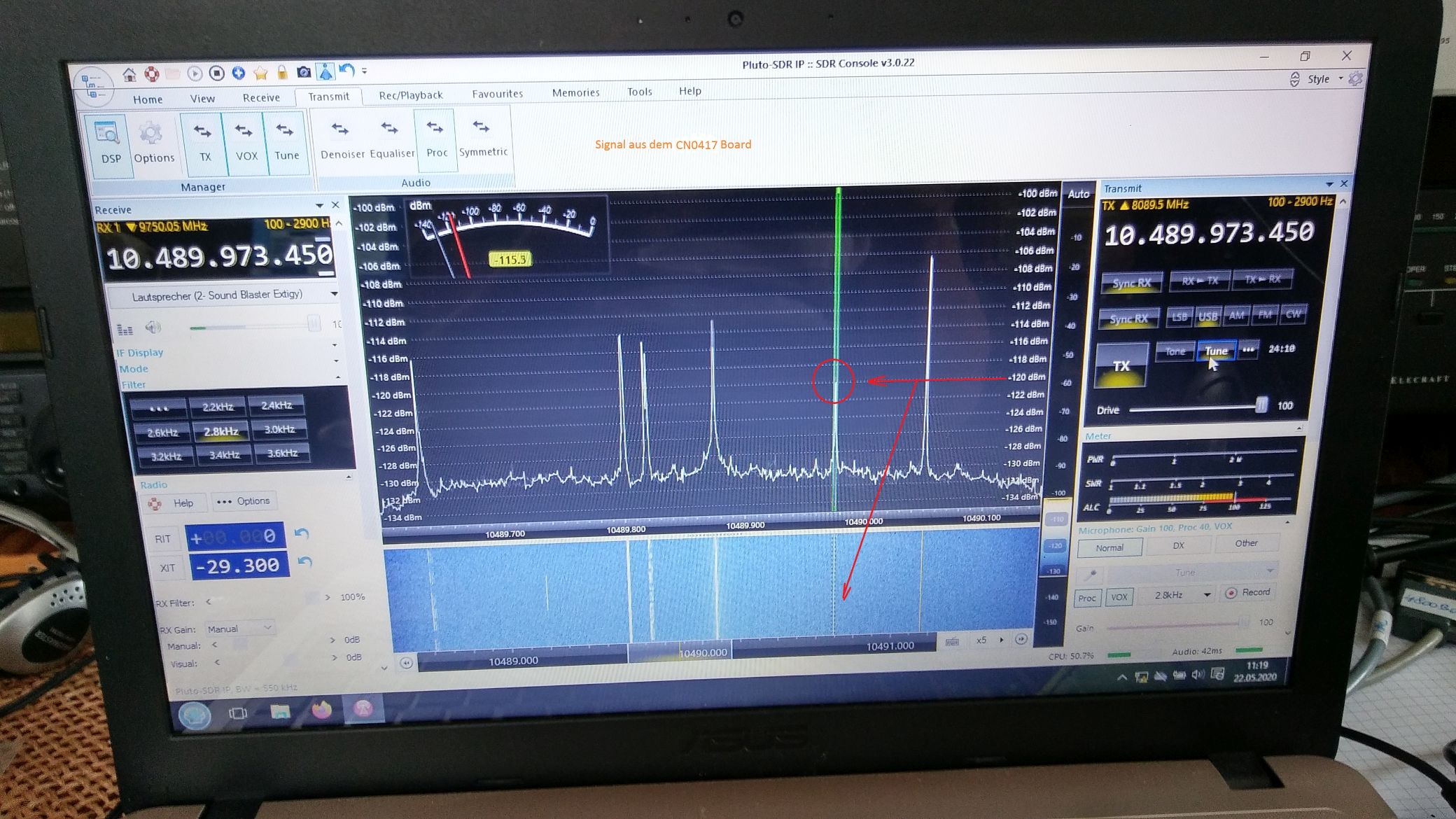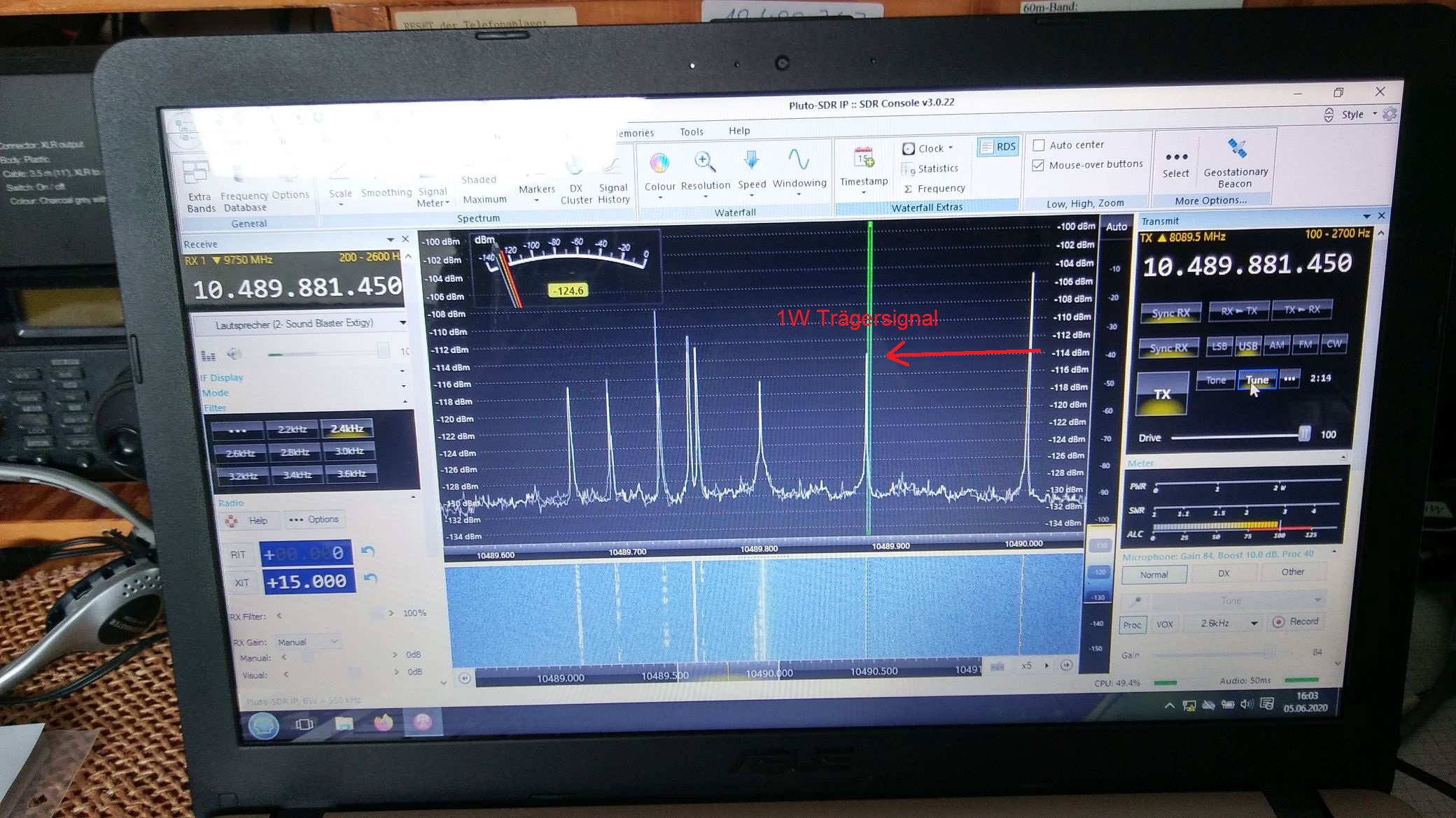 Erster Sendertest am 22.05.2020 mit 100mW, der im Downlink ein SNR von 9dB erreichte: