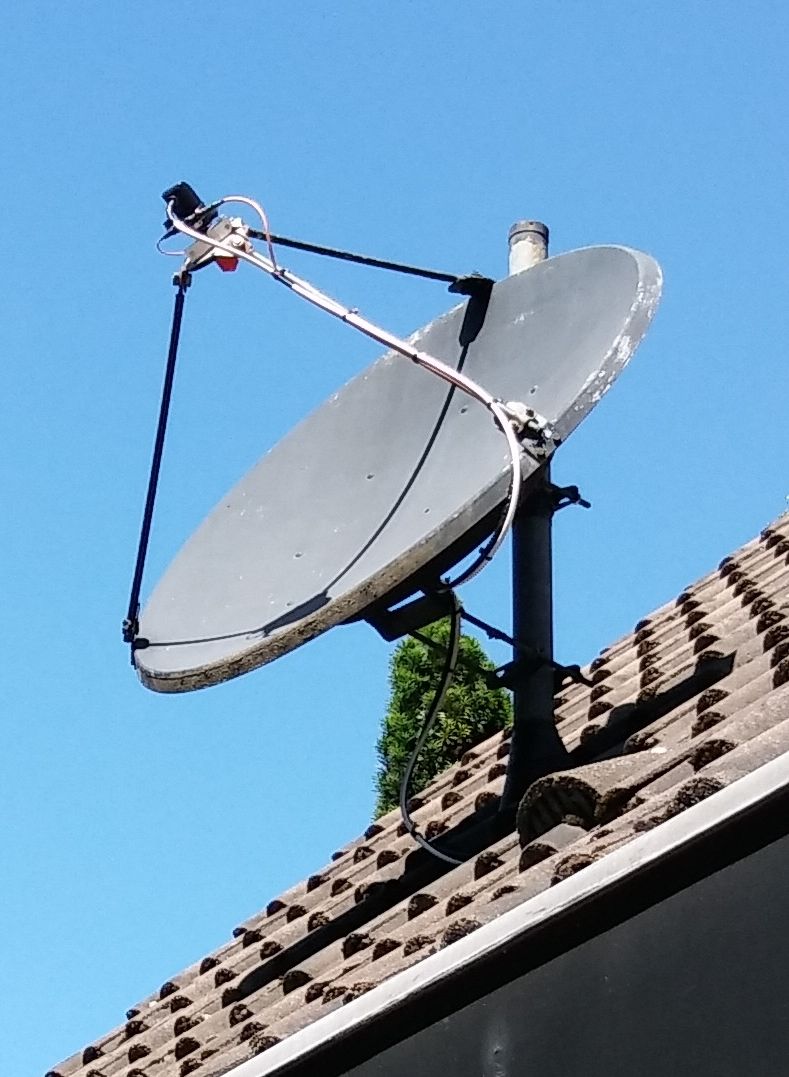 Es sollte vor dem Abriss die Antenne mit einer Rohrzange unter Dach auf die Position 26 Grad Ost verdreht und Empfangsversuche angestellt werden. Der 90 cm Parabol stammt aus dem Jahr 1985 und war ursprünglich auf die Position 13 Grad Ost und Eutelsat-1-F1 ausgerichtet gewesen. Die Elevation sollte erst einmal nicht geändert werden.