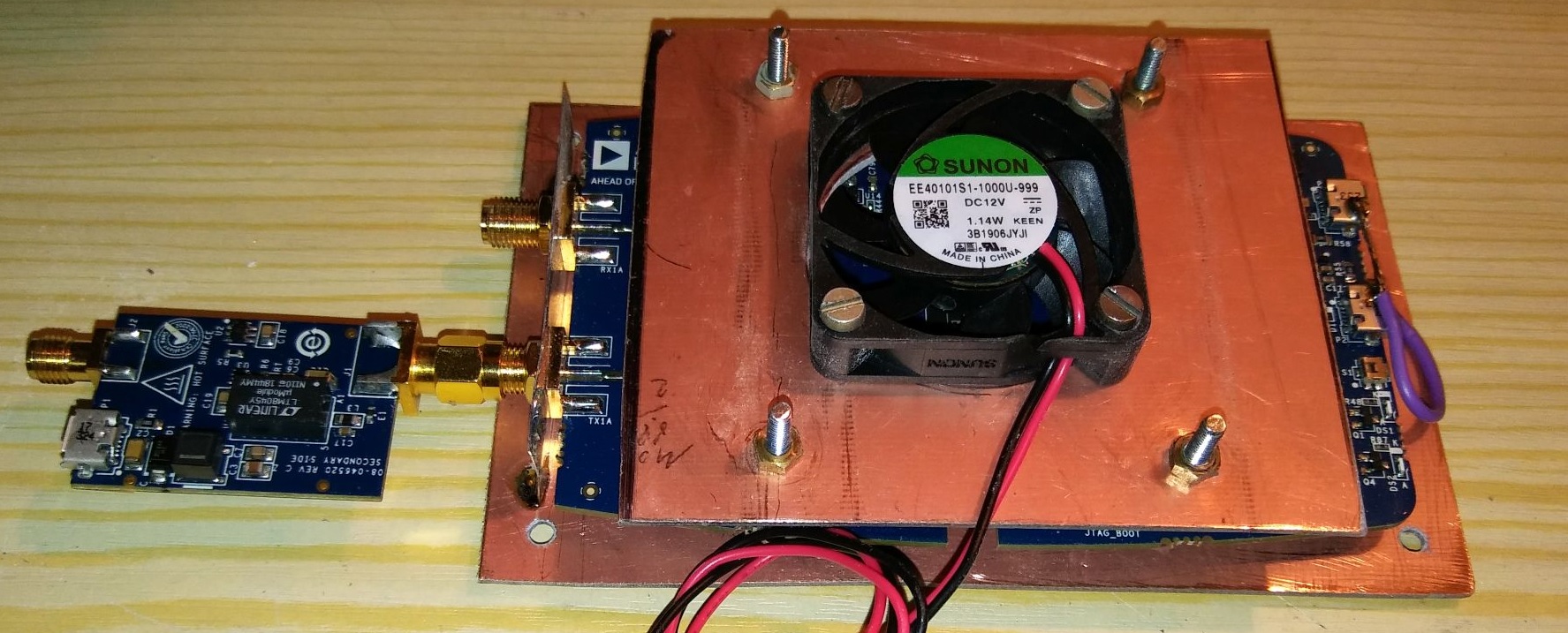 Am Ausgang des Adalm-Pluto steht ein Milliwatt Pegel an, der auf 2 bis 8 Watt verstärkt werden muss. Ich habe hierzu den CN0417 von Analog Devices genommen, gefolgt von einem ausrangierten CDMA-Mobilfunkverstärker. Es geht aber auch ein WLAN-Verstärker. Zu meiner Überraschung musste der Verstärker nicht verändert werden. Kennzeichnend für den Frequenzbereich um 2400 MHz ist der miserble Wirkungsgrad. Die Verwendung eines 28V Schaltnetzteils ist ratsam. In meinem Fall kann es 10A Strom abgeben, von dem aber nur die Hälfte benötigt wird. Aus den 140 Watt Input entstehen circa 20 Watt HF, von denen 8 Watt die Antenne erreichen.