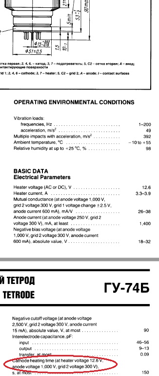 Die NOS-Röhren stammen meistens aus russischen, militärischen Ersatzteil- lagern und haben eine Liegezeit von mehreren Jahrzehnten hinter sich. Aus dem Datenblatt ist ohnehin zu entnehmen, dass das Anlegen der Schirmgitter- und Anodenspannung nach dem Anheizen (12,6V, knapp 4A) frühestens nach 2,5 Minuten erfolgen darf, damit es keine Elektrodenüberschläge in der Röhre gibt. Röhren und Endstufen, die lange Zeit nicht betrieben wurden, müssen unbedingt minimal 12 Stunden, besser 48 Stunden durchgeheizt werden. Danach reichen die 2,5 Minuten, wenn die Röhre mindestens alle 3 Monate hoch- gefahren wird. Selbst nach dieser Behandlung können in den ersten Vollast-Stunden immer noch Überschläge passieren, selbst bei einer Sperrung der Röhre über das Steuergitter mit einer Vorspannung von -90V. Eine flinke Anodensicherung sollte also immer vorhanden sein