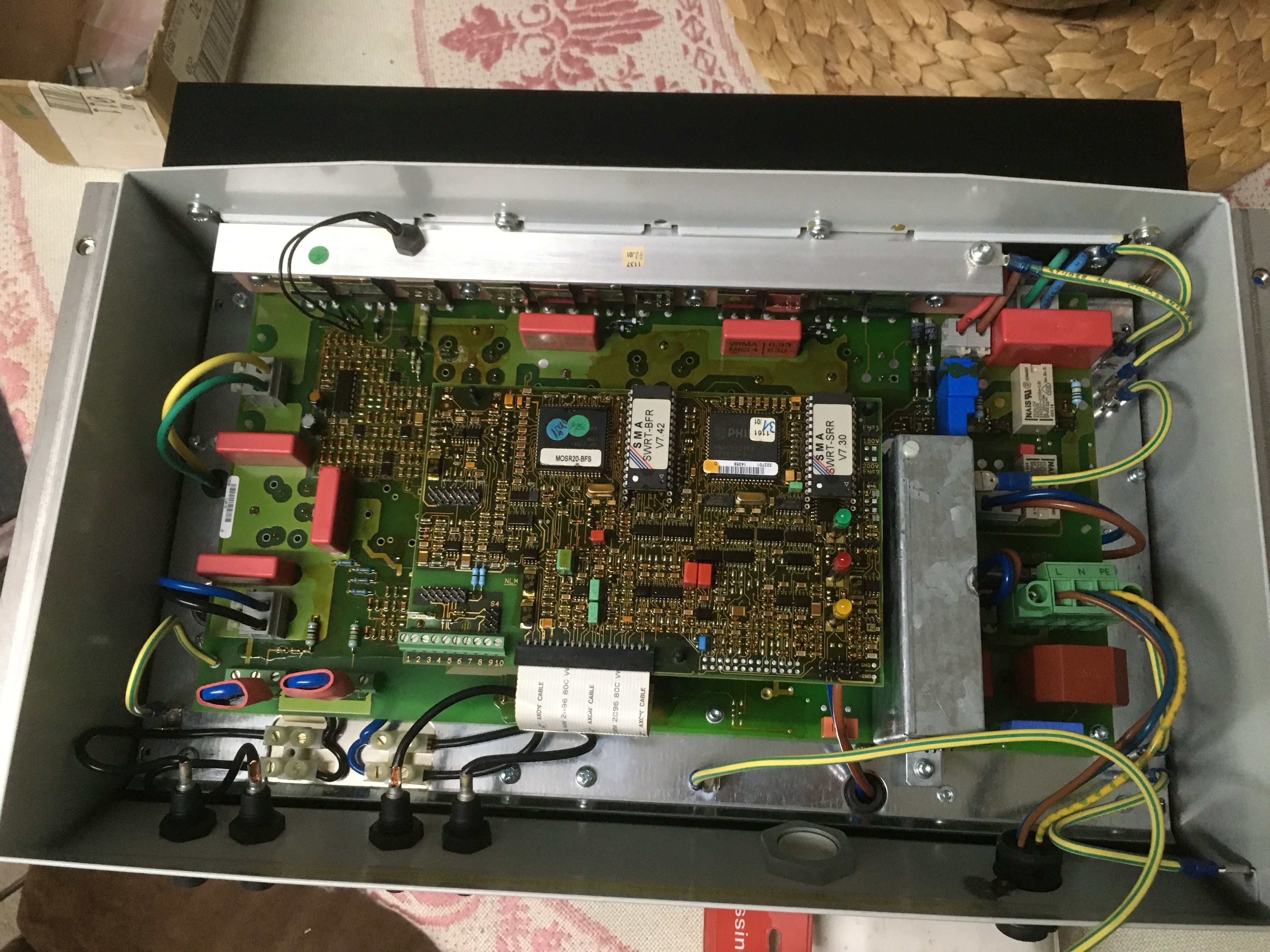 Nun gibt es PV-Anlagen seit gut 30 Jahren. Die ersten Trafowechsel- richter des Marktführers waren 30kg schwer und schirmten sowohl den Ringkerntrafo als auch die Inverter-Induktivität in einer in sich geschirmten Abteilung. Folgendes Bild entstand vor wenigen Wochen. Es handelt sich um einen SB2500, der nach Tausch des 15A-Stromsensors wieder vollständig funktionierte: