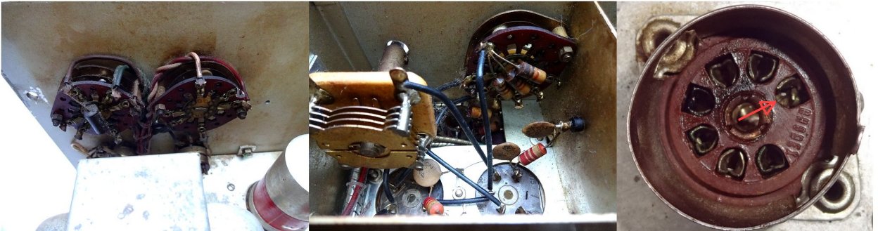Wie vom Anbieter versprochen ließ sich das Radio einschalten - mit ernüchterndem Ergebnis: Von den dreizehn Röhren wurden zwei aktiv und die Skalenlampe leuchtete. Erst das kräftige Bewegen aller Röhren in ihren Fassungen brachte zwei weitere Röhren und den Glimmstabilisator zum Leuchten - mehr nicht. Ursache der Fehlfunktionen ist offensichtlich der allgegenwärtige Teerbelag. Immerhin ließen sich die (Dreh)Schalter, Drehkondensatoren und Potis komplett oder bis zu den Anschlägen, falls vorhanden, bewegen und Ober- und Unterseite des Chassis sind "unverbastelt".