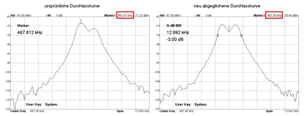 In der folgenden Aufnahme ist die Übertragungskurve des 467kHz-Verstärkers ohne Quarzfilter, links wie vorgefunden, rechts nach Neuabgleich, abgebildet. Die linke Kurve zeigt, dass die maximale Amplitude außerhalb der Nennfrequenz(467kHz) liegt und dass die gesamte Kurve zu höheren Frequenzen verschoben ist, wodurch die besonderen Eigenschaften des Quarz-(Brücken)Filters nicht zur Geltung kommen. Vermutlich wurde dieser Verstärkerteil irgendwann nach der in der Abgleichanleitung des Empfängers beschriebenen Methode(Maximalanzeige des S-Meters) überarbeitet. Beim Neuabgleich konnte die symmetrische, um die Nennfrequenz zentrierte Übertragungsfunktion leicht überkritisch gekoppelter Bandfilter erzielt werden.