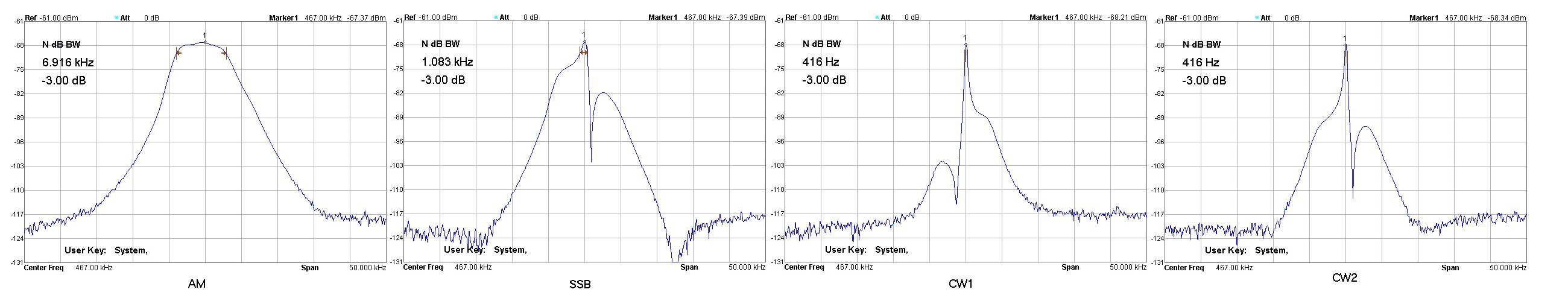 Der Frequenzgang des 467kHz-Verstärkers unter Einbeziehung des Brückenfilters ist unten dargestellt. Die unterschiedlichen Filterbandbreiten in den Teilfotos werden entweder durch Überbrücken des Filterquarzes("AM") oder Zuschalten unterschiedlicher Belastungswiderstände zum Brückenfilter(("SSB " usw) erzielt. Wie zu erwarten verringt sich die AM-Bandbreite des ZF-Verstärkers. In den Fototeilen "SSB", "CW1" und "CW2" ist die Nullstelle des Brückenfilters deutlich zu erkennen. Außerdem zeigen "CW1" und "CW2", dass die Nullstelle sowohl auf die linke als auch auf die rechte Filterflanke verschoben werden kann.